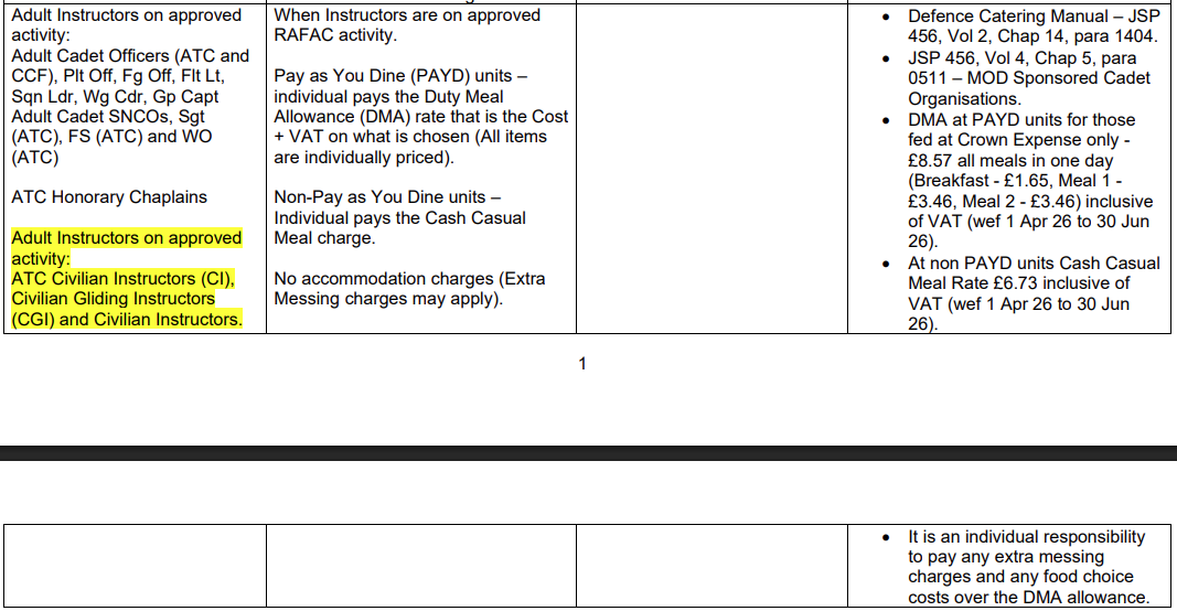 FOOD AND ACCOMMODATION CHARGES FOR RAFAC VOLUNTEERS AND CADETS 2026/27