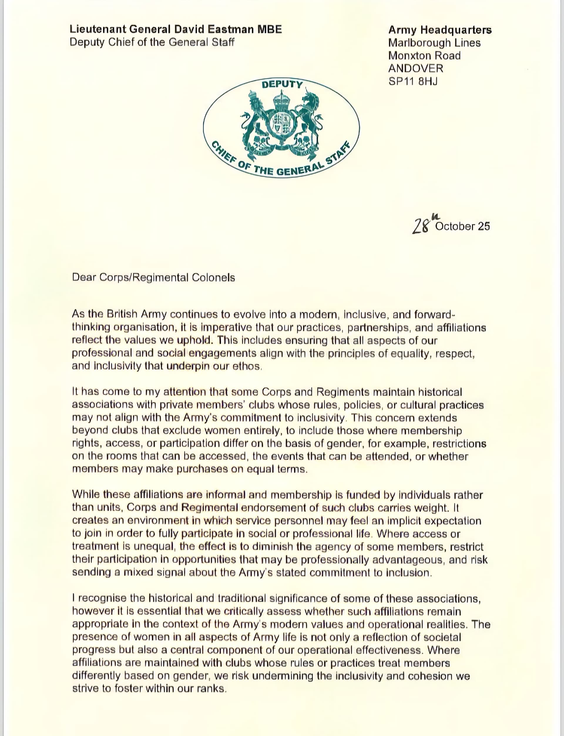 Ensuring that regiments don’t support clubs which treat women as second class citizens is an entirely sensible part of it.