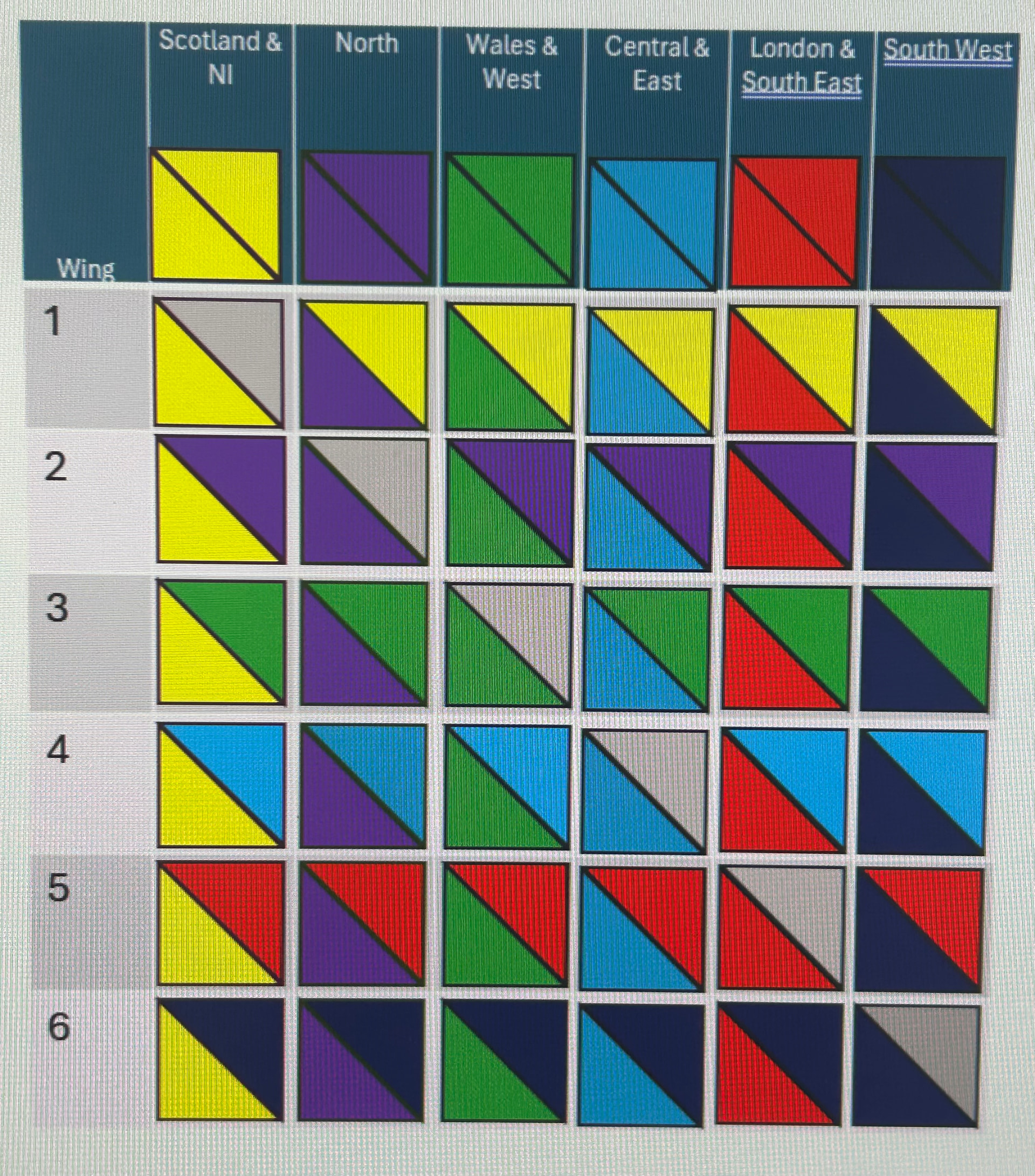 ChatGPT giving a rather bad, but workable example. Back colours per region, then some very shorthand thing for each wing. Better than just another colour for the wing as who the hell can remember 36 colour combinations!