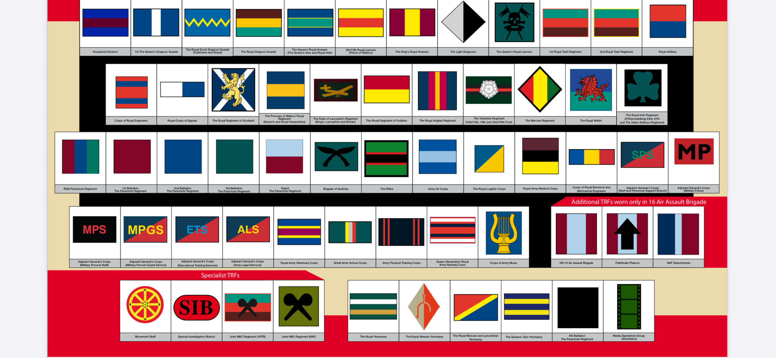 The Parachute Regiment might have something to say about the solid red, blue, and green ones, and I think either SNI 1 Wing or SW 5 Wing might be RLC – but, generally, I think this works.