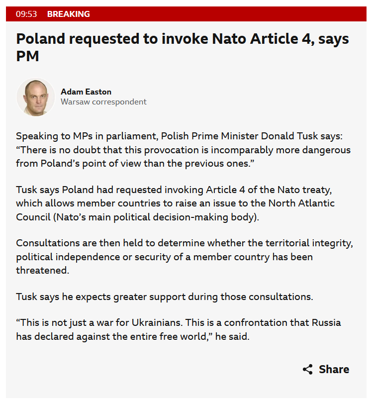 That said, if it becomes apparent that this time is different - let’s say the drones were actually destined for somewhere in Poland or they strayed far deeper into Polish territory than before - then the only reasonable response, according to the wording of the North Atlantic Treaty, would be an invocation of Article 5. Anything else at this stage would given Putin carte blanche to carry on his offensive actions towards NATO allies.