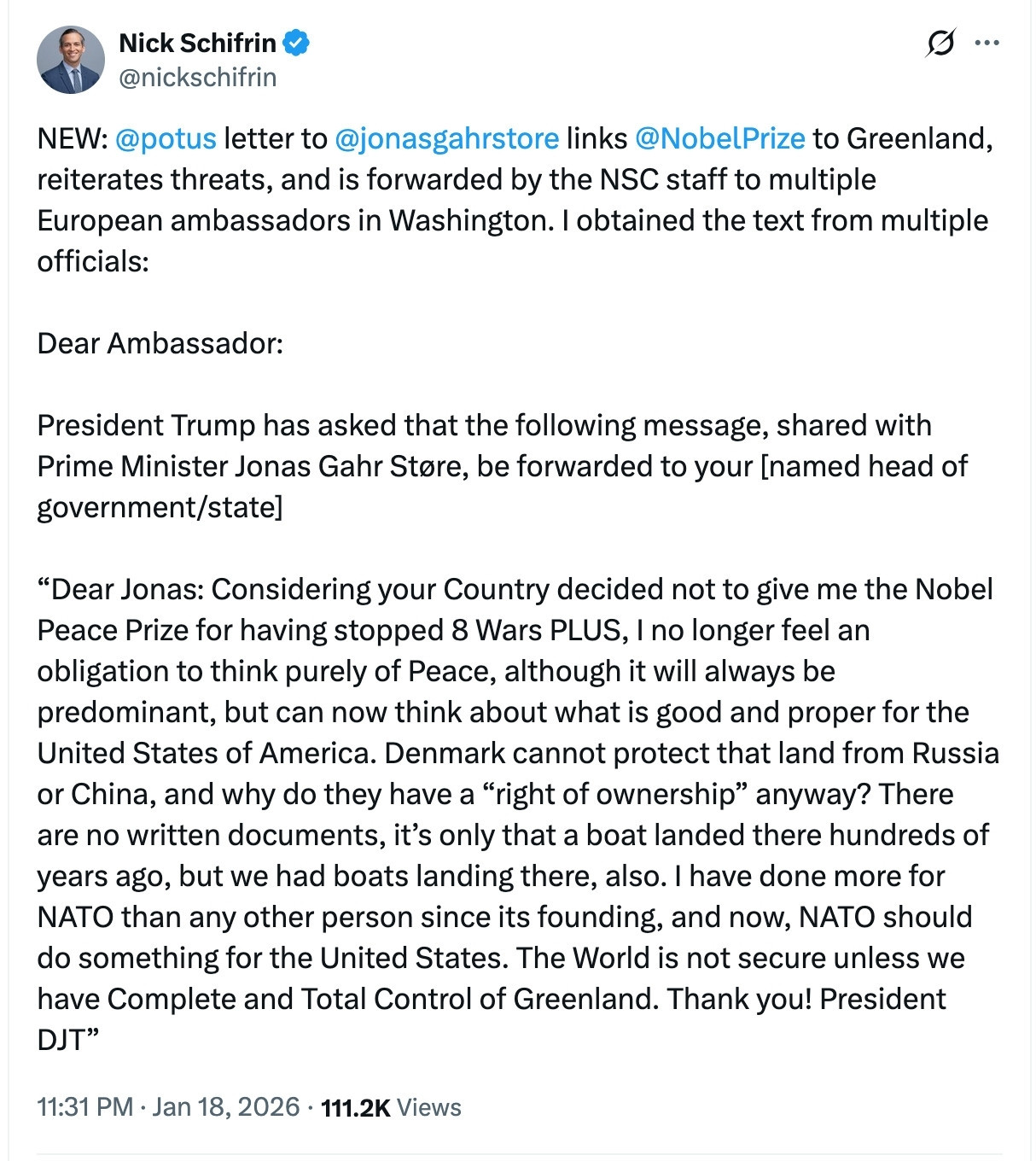 So BBC News are reporting (live TV, not written yet) that Trump allegedly told the Prime Minister of Norway that he no longer needs to consider their views because Norway didn’t give him the Nobel prize after “stopping all those wars”